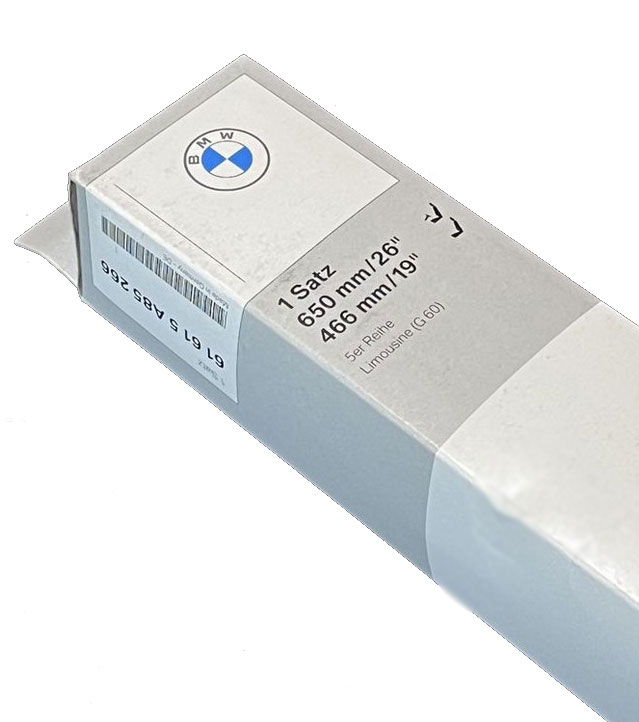 ОРИГИНАЛЬНЫЙ Комплект из 2-х бескаркасных щёток стеклоочистителя на ветровое стекло авто BMW 5 (G60, G61) (с 2023- ) пр-во Valeo (коробка BMW). Размер щеток 65см и 47см. Крепление на дворниках УСЫ. Оригинальноый номер 61615A85266 со специальным вырезом на спойлере!. Оригинальные щетки взаимозаменяемы с комплектом 61615A43610 (7-я серия)